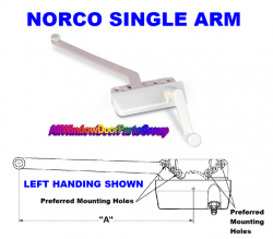 Old Norco Window Single Arm Roto-Gear Operators, old style Norco Casement Window Replacement Parts, as shown. Recommended for use on Norco narrow casements and awning windows, or for round top, arched top, and trapezoid windows that use a butt hinge. Sash weight should be limited to 40 lbs. to insure ease of operation. Can also be shipped complete with # PP-454 crank handle, # PE-341 gear box cover and screws if desired? Used with # PF.75 hinge and # OE-706 track (sold separately).