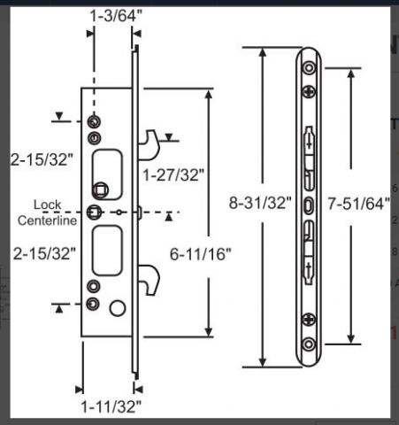 Mortise Assembly For Patio Door units; Two (2) Point Locking Unit assembly with measurements as shown in picture; Could also fit some Bolt mortise and lock body for storm doors; Lock Keeper For Two Point Mortise Lock As Shown is included; Please review and check your measurements.