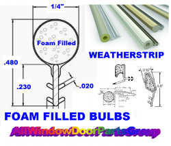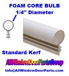 1/4" diameter, foam filled, window and door "kerf slot" weather strip seals for window sash components, single hung, double hung, sliders and casement windows in several brands and styles; some brands of doors; Weatherstrip seal, kerf bulb seals in WHITE. See Diagrams / Pictures below; Also available elsewhere on this site in smaller rolls , 50' and 25'.