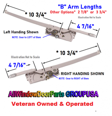 Units come in Left or Right Handing (See Picture Details). The standard is normally the 4 7/16" "B" Arm, however there are also 2 7/8” or 3 ¾” - SPECIFY Handing (Left or Right) and Optional "B" Arm Lengths in the ORDER COMMENT SECTION AT CHECKOUT. If none is specified, we ship standard 4 7/16" "B" Arm / Left Handing.