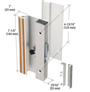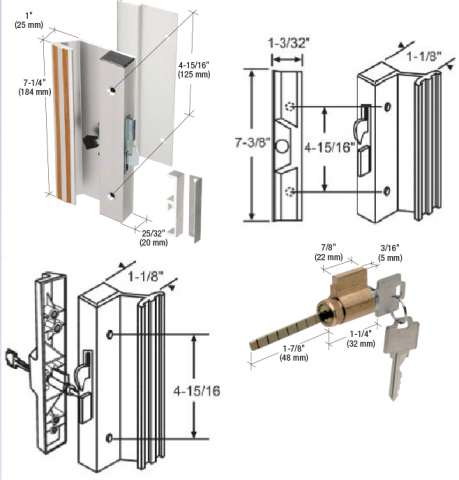 AllWindowDoorParts GROUP-USA - Biltbest Sliding Patio Door Handle Assembly Available in Black, White, and an Aluminum Mill Finish. Low Profile Hook Style Surface Mount Sliding Glass Patio Door Handles, 4 15/16" C-C Screw Holes; Available in Aluminum, Black and White Models; Catalog Number: BB-CPEE; Biltbest Window and Door Parts PDF's; Overall Length: 7-1/4"; Center-to-Center: 4-15/16"; OPTIONS AVAILABLE FOR THIS ITEM ( NOT INCLUDED ) BBDPI-68, Sliding Glass Door Bumper, 1 13/16" Length; BBE-REE, cylinder lock with compatible keyway for Weiser, Kwikset and Weslocks;