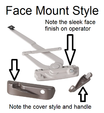 PLEASE NOTE: These are the most commonly confused and mis-ordered parts. Please Look Closely at the biggest difference in models - look at the "formed face" of the unit vs. one that has no face on operator. Please Send Us Pictures of your Unit IF NOT SURE. The proper "handing" is also a critical factor. Face Mount Styles - This is a special order item and non-returnable. This is not the "most common style used" for normal Old Casement Windows Circa 1960's, 1970's, 1980's, 1990's | PLEASE LOOK AT HOW THIS UNIT IS NORMALLY INSTALLED AND OTHER ACTUAL PARTS - This is the main way to tell them apart. Specify whether a left handed or right handed. If not specified we ship left handing.