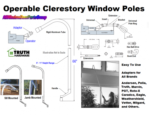 Basic Clerestory Window Extension Crank Handle. Made to utilize your existing crank operators with proper adapters - no adapters included. These are special order units will make your life easier and better! All you need to know is the distance of your clerestory window operators from the floor - used for Truth, Entry-Gard, Marvin, Integrity by Marvin, Peachtree, Alenco, Better-Bilt, Caradco, Crestline, Vetter, Wenco, Jeld-Wen, Andersen, Craftline, Seal-Rite, Thermal-Guard, Weather-Craft, Silverline, Thermal-Gard, Traco, Weather-Shield, Lincoln, Eagle, Kolbe, PGT, Andersen, Pella, Ply-Gem, Milgard, MI, Sierra Pacific, Weather-Shield, Cascade, Quaker, Norco and others.