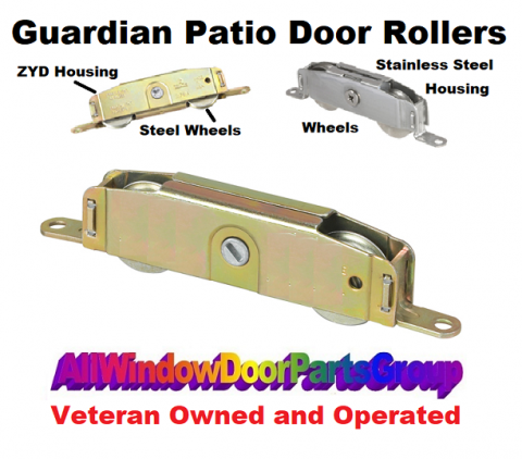 Dual 1 1/4" Wheel, Tandem Style Patio Door Roller Replacement Set AS SHOWN BELOW - these tandem patio door wheels sets are Priced Per Set of Two (2) Units As Shown in Bottom Left Picture .. ZYD Housing and Steel 1 1/4" Diameter Rollers to replace the old patio door roller wheel assembly as shown to fit some sliding glass patio doors with Guardian [GLASS] PGT, PPG, Herculite tempered glass and some other brands of patio sliding glass doors. SEE DETAILS AND MEASUREMENTS.