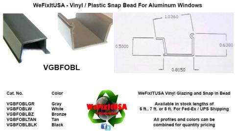 Built-Best Window Glazing Bead Parts Supply, VGBFOBL, Window and Door glazing bead and weather strip parts, snap-in-bead, images, free research and ID help, spline, strips of profiled wood or vinyl used to hold the glass in position in the window sash. PDF Glossary Guide, terminology, dimensions and measurements, Glazing Bead for windows of all types - Casement, awning, single and double hung, aluminum, vinyl and wood windows - all obsolete and out-of-production brands.