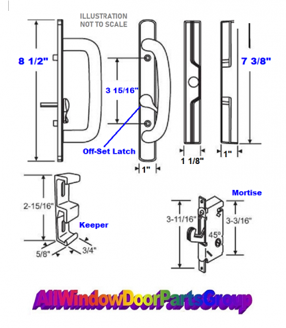 Sliding Glass Patio Door Handle Set Replacements, White, in both RIGHT and LEFT Handing Models. Stock # PO-FFP-RH/LH with Offset Latch. New Mortise Lock as Shown (included) . Industry may have been used on Guardian, Herculite, PPG, PGT, Lincoln, Crestline, Caradco patio doors.