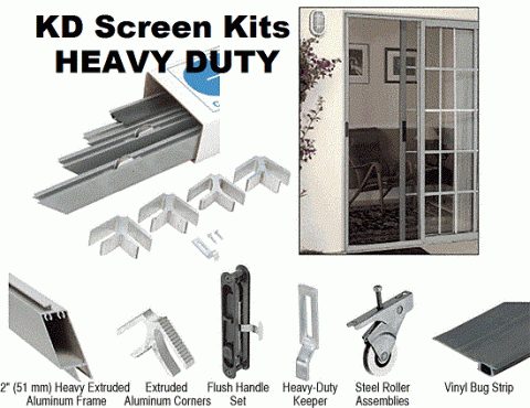 This 30" Wide Screen Door kit comes with pre-mitered top and bottom rails, rollers and corners pre-installed. Satin Anodized Heavy Duty 2" Extruded Aluminum, .043" thickness, KD Sliding Patio Door Screen Replacement Kit. PLEASE NOTE: THE WIDTH OF THIS DOOR CANNOT BE CHANGED SO ORDER CORRECTLY - Kit comes complete with 1-3/8" diameter steel ball bearing adjustable rollers. Door supplied with a universal pull handle with a steel latch hook and the diecast keeper and vinyl bug strip. The recommended retainer spline size is .135". and your choice of screen mesh (not included).