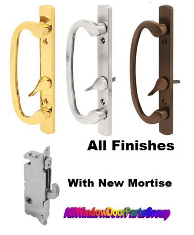 Guardian Glass Sliding Patio Door Replacement Handle Set with the Off Set Style Latch as Shown and Round Face Mortise Lock. NO KEYLOCK IS INCLUDED - Guardian Style Patio Door Handle Set, Off-Set Latch, New Round-Face Mortise is Included. Replacement Handle Set, Loop, Clam Style Handle as Shown | All Finishes Available - Please Note All Changes for New Style. Sliding Patio Glass Door Handle Set With Matching Outside Handle - No key lock / No Keyway. PLEASE SEE THE PICTURES BELOW - NOTE: Unit Has The "offset latch" assembly (not centered), 3 15/16" Hole Alignment. ADDITIONAL FINISHES INCLUDE: Almond (ALM), Bright Brass (BB), Brushed Chrome (BC), Black (BLK), Bronze (BRZ) and Antique Brass (AB) - THIS LISTING IS FOR THE WHITE UNIT ASSEMBLY. If you want other finishes please specify in the "comment section" at checkout.