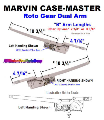 Old Style Casement Operator Model for OEM REPLACEMENT - Our Model# MV-RFPI - REPLACES THE OLD STYLE UNITS 1970's 1980's / 1990's - Normally used with removable / hidden sill stops. Also available with variations / models with shorter "B" Arm lengths - This one is the 4 7/16" Arm. ( see diagrams ). If you need the shorter arm length specify in the comment section at checkout.
