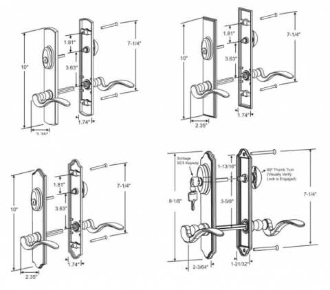 Old peachtree Door Hardware Replacement Sets for active doors, inactive doors and sets for French Doors; Replacement handle sets for your old Peachtree Wood and Clad Doors, Inswing and Outswing style french doors, Double French Door Sets, Arch Top Peachtree Doors, Multipoint Lock Sets - All types and styles of Peachtree Door Replacement Hardware and Handle Sets - Review All Dimensions Before Ordering - the 8" Model can be replaced with 10" -- These are Special Order Units.