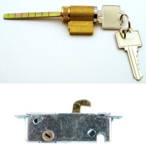 Guardian Sliding Glass Doors / Patio Door Sliding / Glider Doors - Handle Set Assembly with key locking parts and assembly; Model # PI-05 with mortise assembly parts, # PI-410-F; Fits Guardian Glass Door Models, Crestline, Caradco, Lincoln and some others; Installation holes 3 15/16" on center; KEY & MORTISE INCLUDED; Deluxe wood handle set comes complete with inside and outside pulls and screws; Bronze finish.