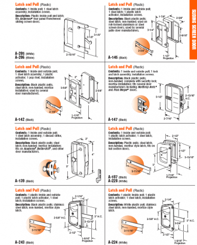 Sliding Screen Door Parts, Latch and Pulls, Plastic inside pull and latch; fits Andersen Screen Doors, four panel Frenchwood sliding screen doors. A-205 (White) A-206 (Stone) Latch and Pull (Plastic); Description: Black plastic pulls; steel latch; non-handed; mortise installation; used by several door manufacturers; A-142 (Black) Latch and Pull (Plastic); non-handed; used on roll-formed aluminum or steel screen doors; used by several patio door manufacturers. A-145 (Black) Latch and Pull (Plastic); Black plastic pulls; non-handed; complete with security lock; mortise installation; fits several door manufacturers including Northrup Arch. and Fran Meyer doors. A-147 (Black) A-187 (Black) A-228 (White) Latch and Pull (Plastic) Black plastic pulls; steel latch; non-handed; mortise installation; fits on Academy, Better-Bilt, and other door manufacturers. A-139 (Black) Latch and Pull (Plastic); Latch and Pull (Plastic) , Black plastic pulls; stainless steel latch; non-handed, mortise style latch. A-243 (Black) A-1 Latch and Pull (Plastic); A-224 (White) 3-1/8" 2-1/8" 2-15/16" 3-5/8" 2" 2-5/8" 1-7/8" 2-5/8" 3-1/4" 2-3/4" 2-1/4" 2-9/16" 3-1/2" 2-13/16" H.C. 2-7/16" 3" 4" 2" 2-1/2" 2-1/2" 3" 1-7/16" Projection 1-9/16" Projection 3-13/16" 3-11/16" 3-11/16" 3-11/16" 2-1/16" 3-13/16" 1-9/16" - Pricing Starting at $9.95 and Up.